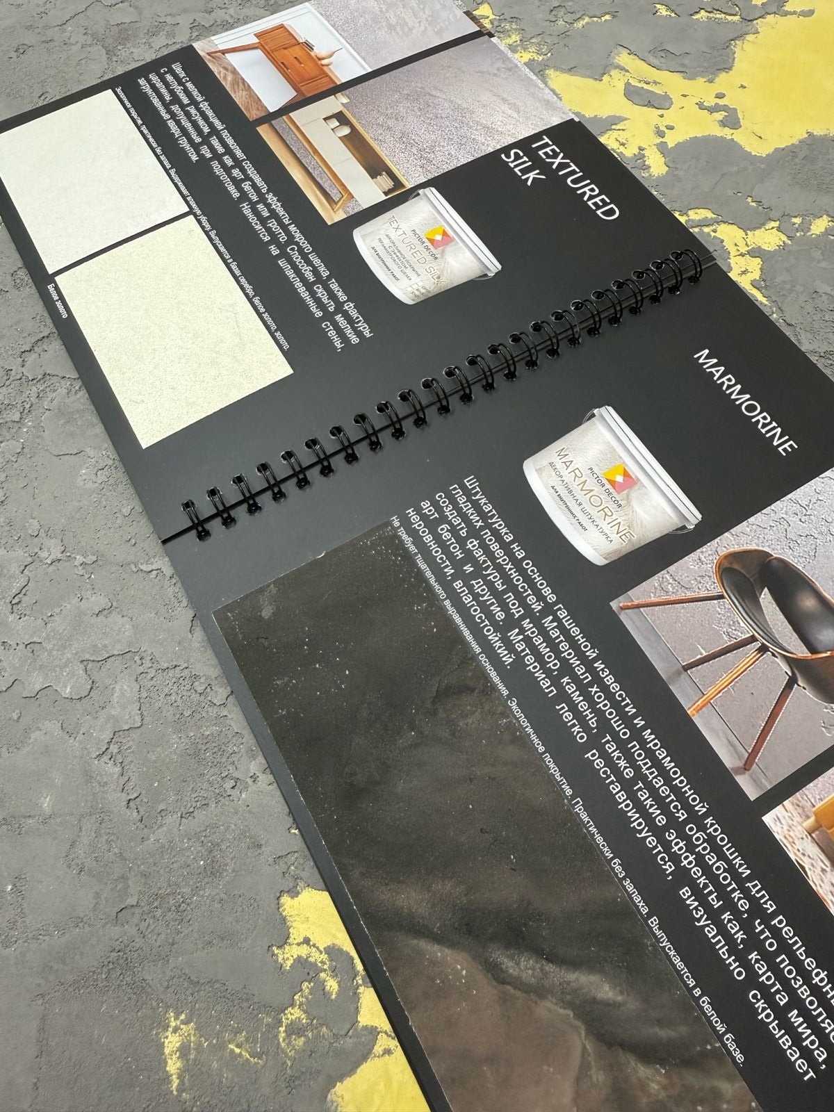 Каталог с реальными выкрасами основных материалов в базе и двумя цветовыми палитрами в мини варианте (Suede, Dense silk).